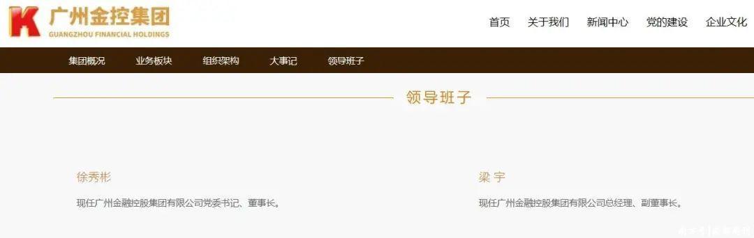 南都·湾财社记者查询广州金融控股集团有限公司官网发现,公司“领导班子”栏目已更新,显示徐秀彬现任广州金融控股集团有限公司党委书记、董事长。